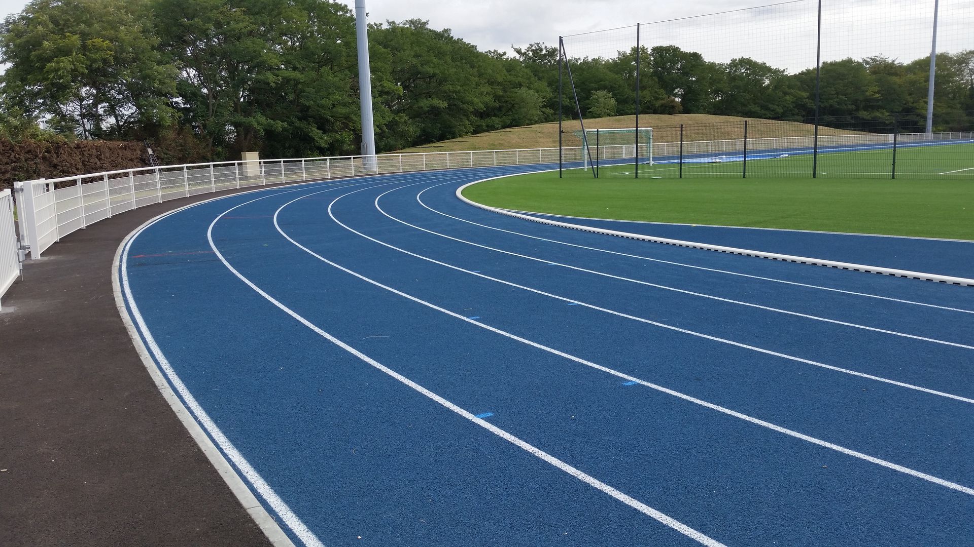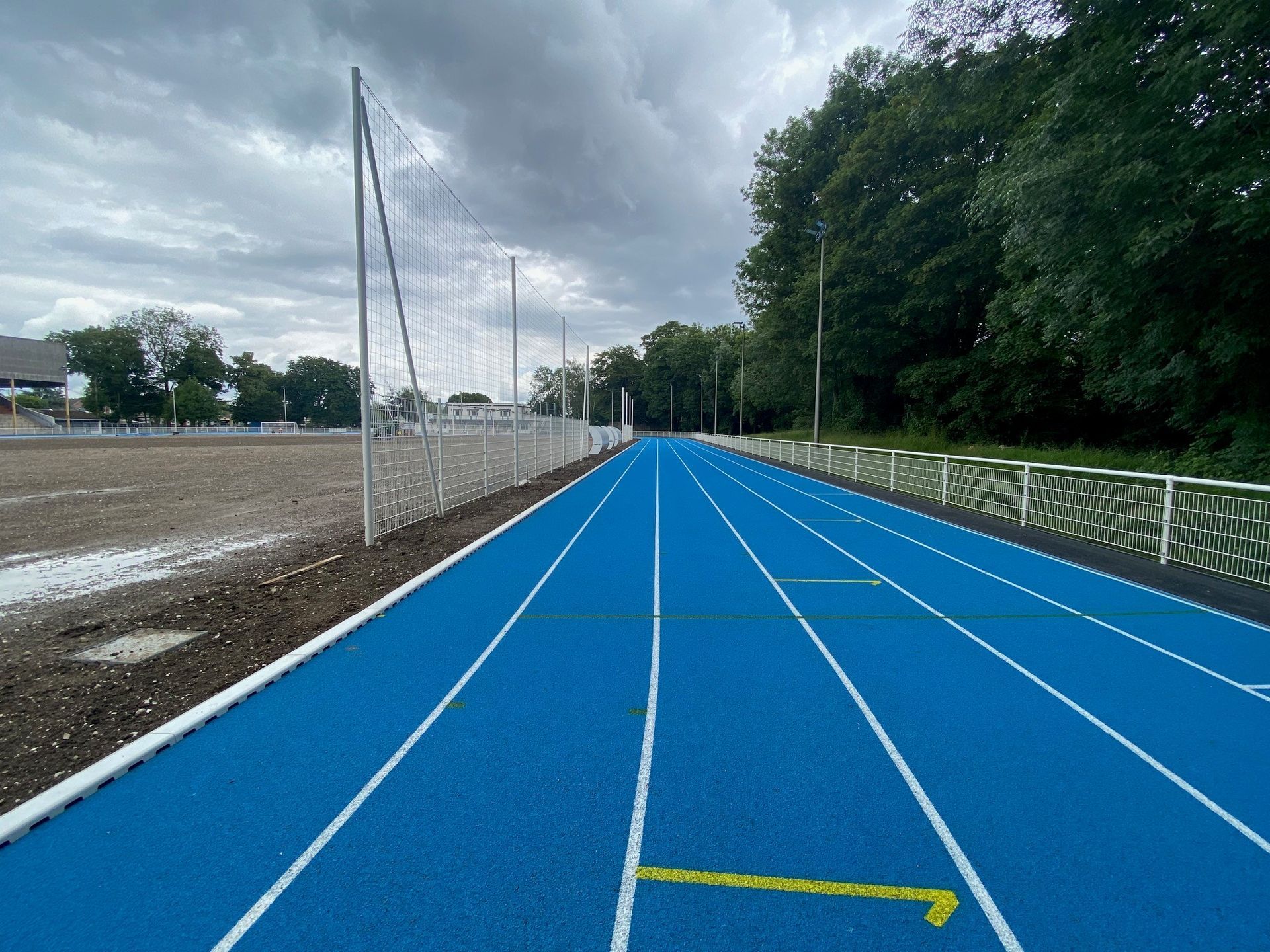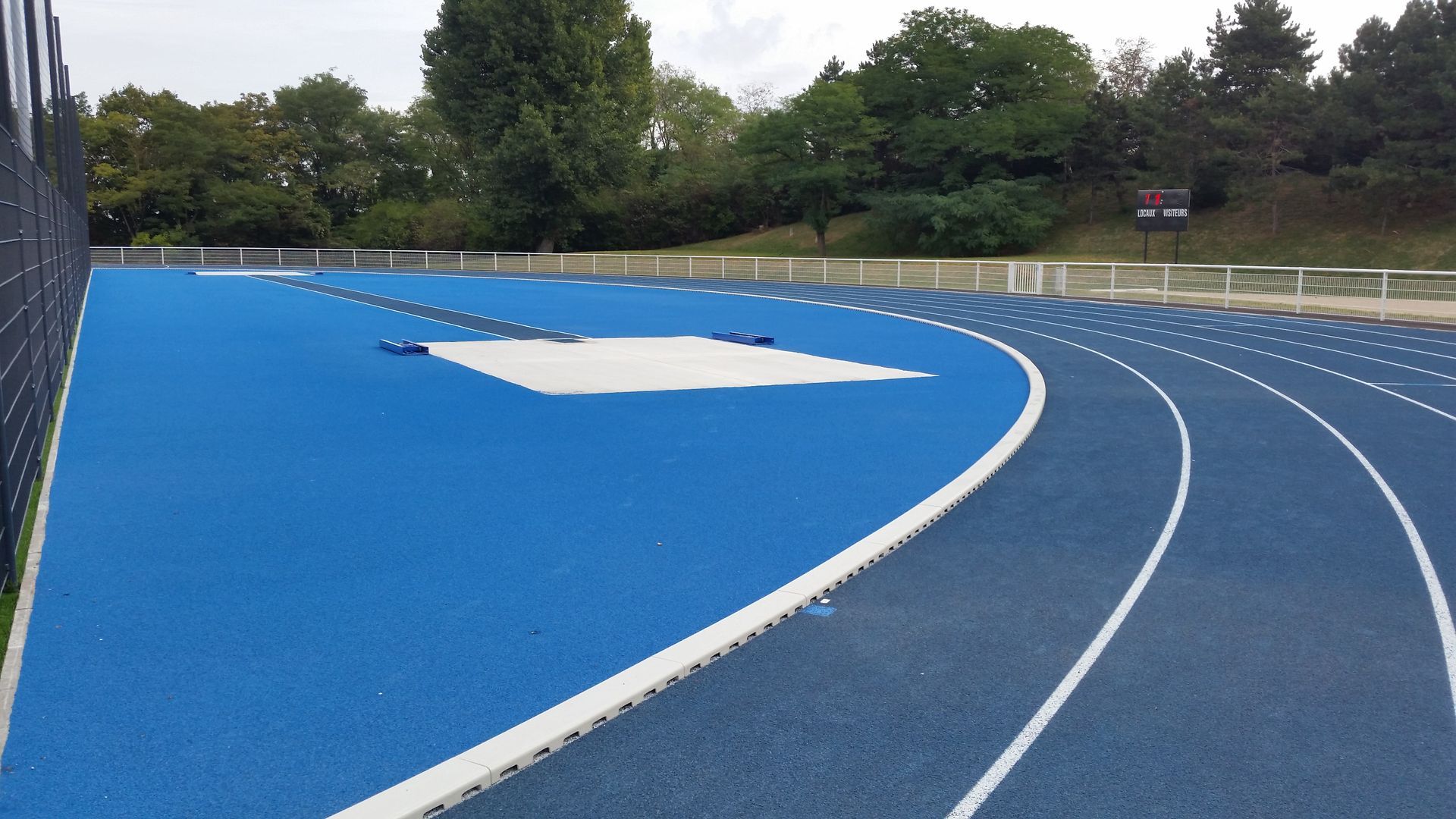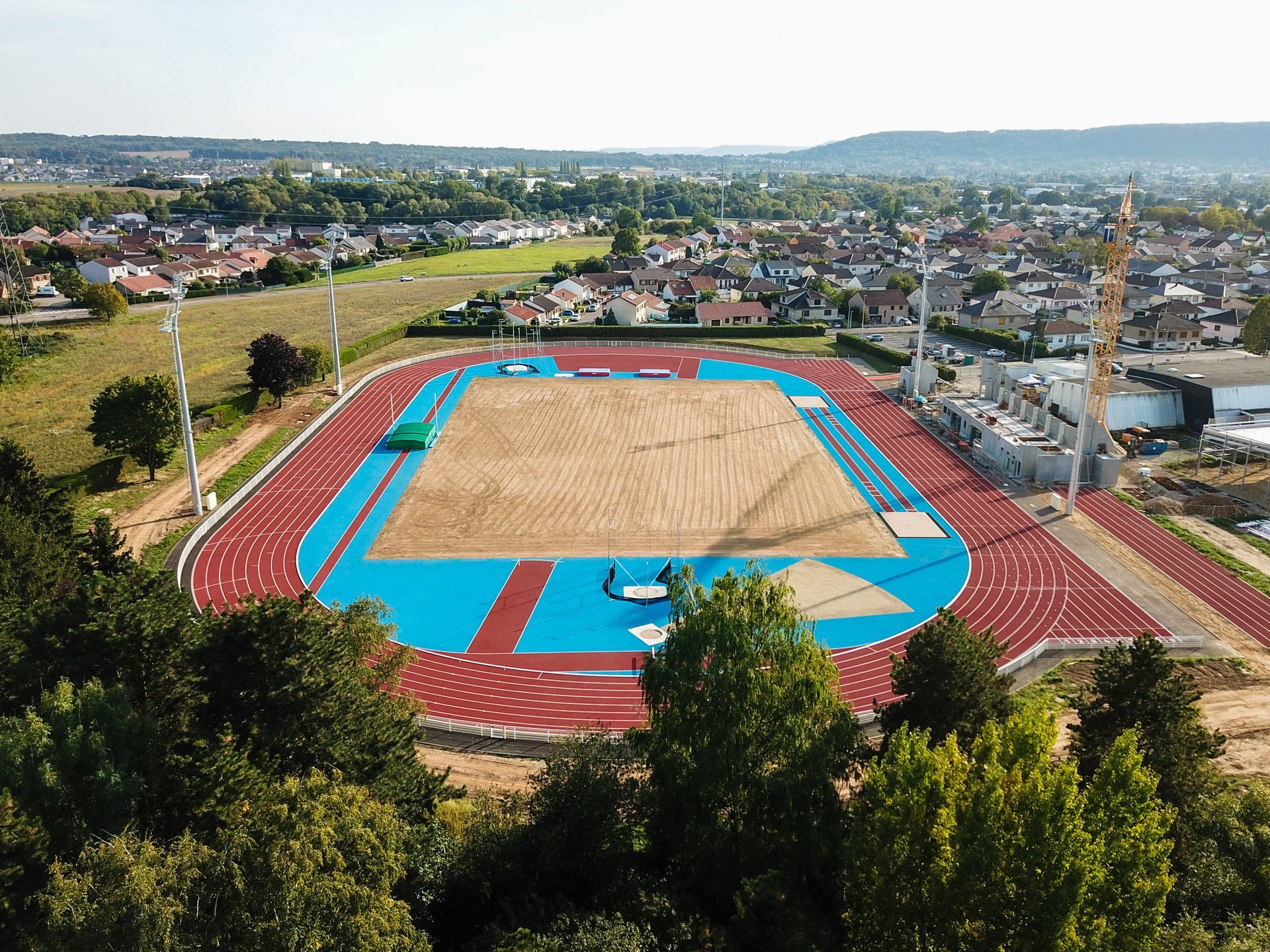 Réfection de la piste d'athlétisme 400 m, 6/7 couloirs, niveau REGIONAL, avec ateliers (triple saut, perche, hauteur, lancer de poids) et tour de chronométrie ainsi que la réfection du terrain de football en substrat élaboré