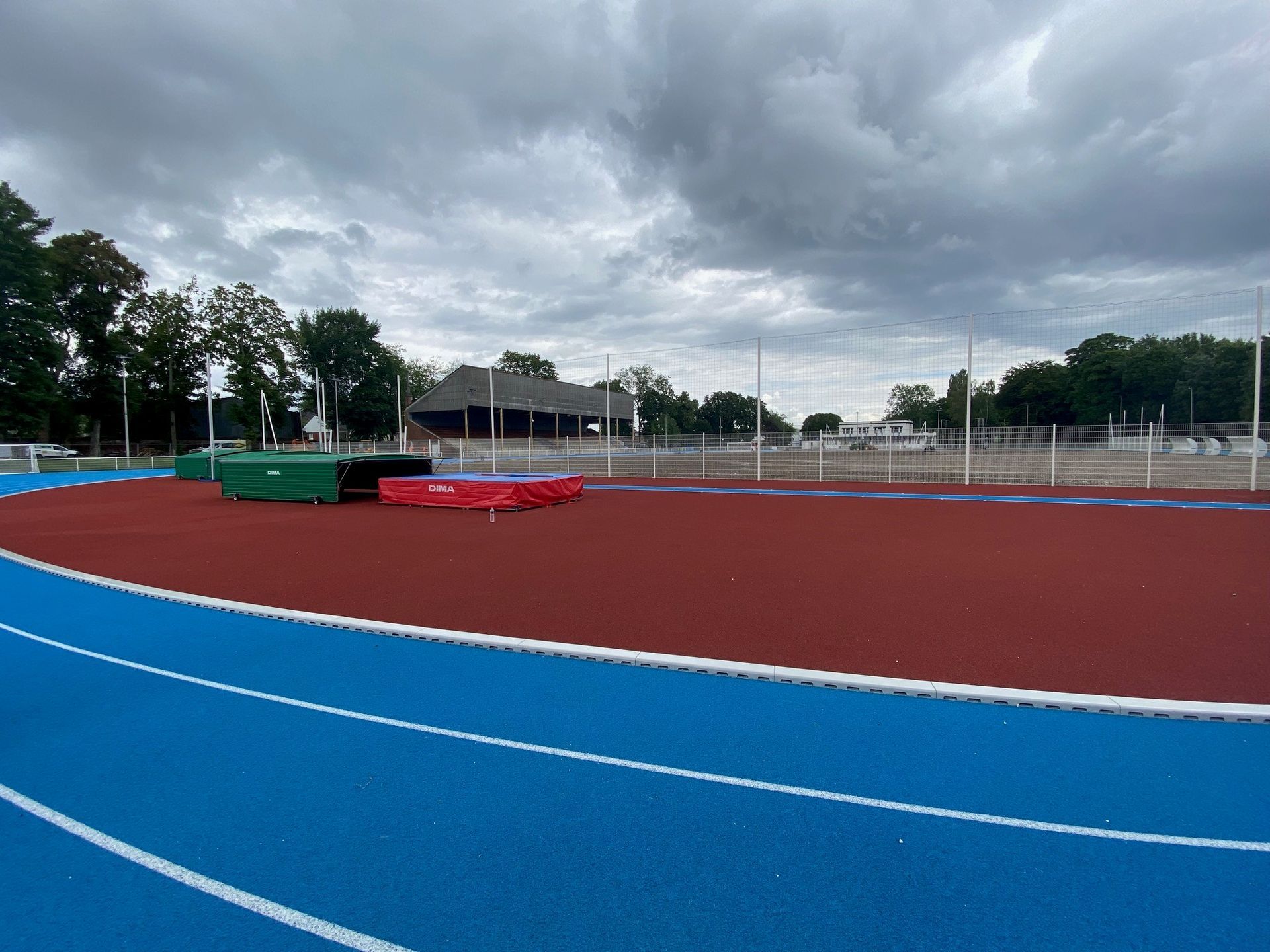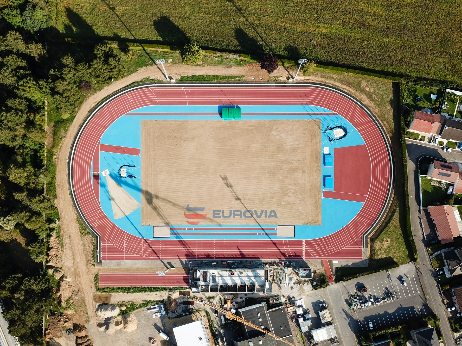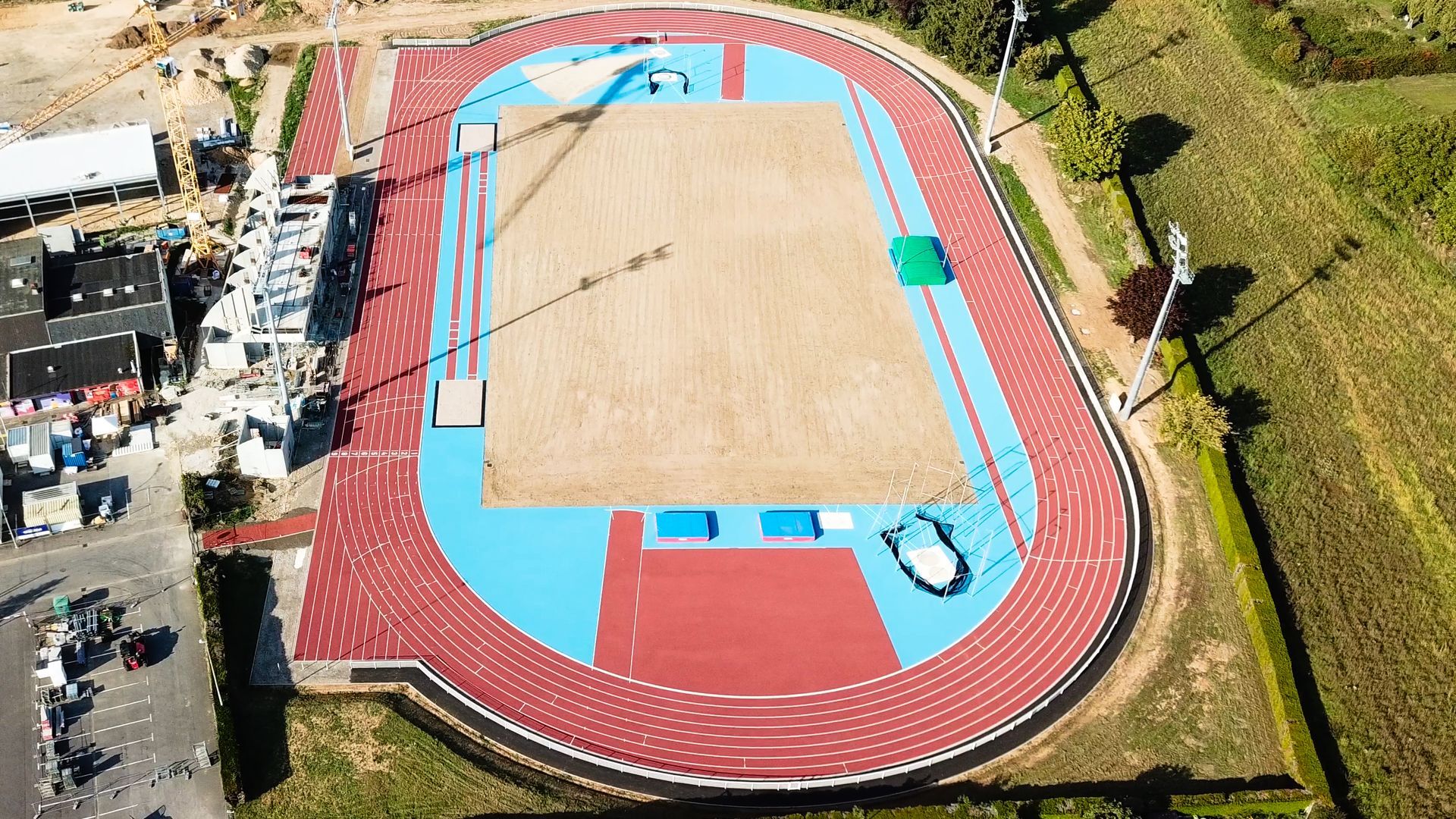 Construction d'une piste 8/9 couloirs 400 m, niveau NATIONAL avec ateliers de concours (sauts en longueur, hauteur, triple, perche, lancers de poids, disque, marteau et javelot) et éclairage, zone d'échauffement 6 lignes droites et construction de vestiaires / tribunes